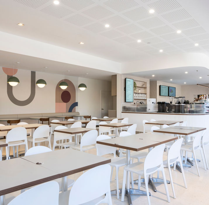 This 310 m² hospitality fitout, designed by The Café Collective, was delivered within the Harry Perkins Institute and required seamless integration with existing building services in a live research environment. The venue was re-imagined to create a warm, contemporary space, with the new layout incorporating a production kitchen and cool room, FOH service area and high‑end finishes throughout the café and service areas.